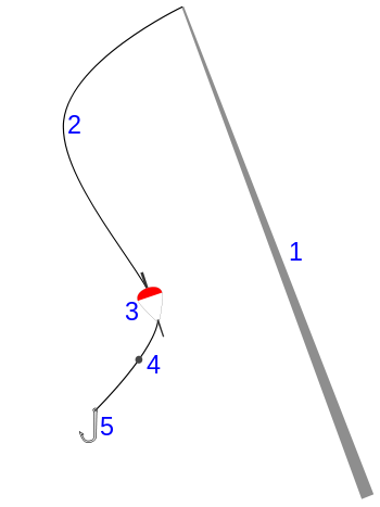 1 - удилище 2 - леска 3 - поплавок 4 - грузило 5 - крючок